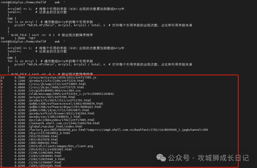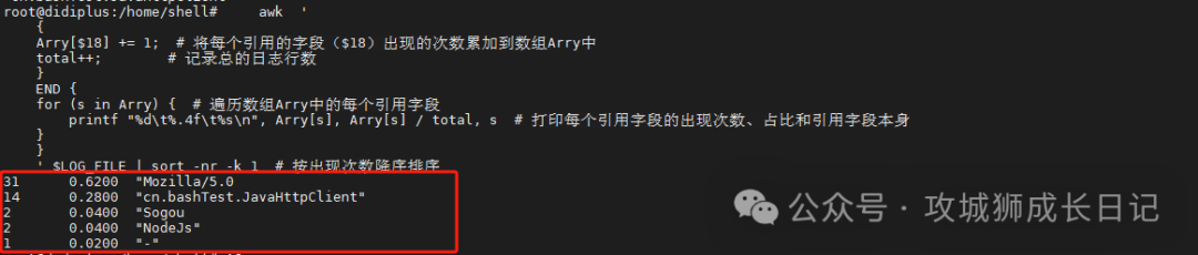 User-Agent`awk ' { Arry[$1] += 1; # 将每个IP地址出现的次数累加到数组Arry中 total++; # 记录总的日志行数 } END { for (s in Arry) { # 遍历数组Arry中的每个IP地址 printf "%d\t%.4f\t%s\n", Arry[s], Arry[s] / total, s # 打印每个IP地址的出现次数、占比和IP地址本身 } } ' $LOG_FILE | sort -nr -k 1,1`