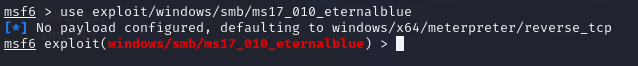 命令3:use exploit/windows/smb/ms17_010_eternalblue 这条命令是进入到我们即将使用的模块中,因为我们是渗透实验,所以我就不去探测主机了,因为它是百分之百可以渗透进去的。
