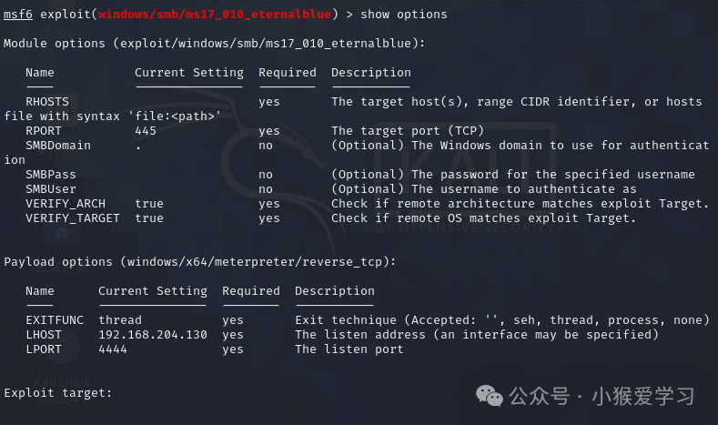 这里可以看到一些我们需要设置的东西,如果它后面的需求required是yes,那就说明这个是我们必须要设置的。rhosts就是即将渗透的靶机的地址,lhosts是我们攻击机的地址,rport则是渗透的靶机的端口,lports就是我们的端口啦。