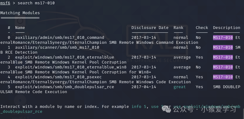命令2:search ms17-010 这是寻找关于这个漏洞可以用到的一些模块。因为我们这次测试的漏洞是永恒之蓝(ms17-010)所以我们需要寻找它的一些测试模块来进行后续的使用。