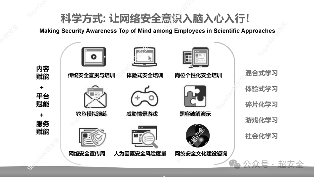 以往听安全培训、看安全视频和海报、读安全手册、喊安全宣传口号,往往让员工印象不深,甚至还会觉得网络安全与己无关,对网络威胁存有侥幸心理。通过VR或3D模拟威胁场景、攻防设备模拟演示、交互式培训等方式,避免以往呆板枯燥的灌输式、说教式安全意识培训,让员工从视觉、听觉、触觉等感官全方位、多角度体验安全威胁,不再是被动接受安全信息,亲身参与和感受到黑客攻击与数据泄露的发生过程、后果和防御措施,从而触动员工的安全意识觉醒,促进员工的安全行为养成。行为科学研究已经证明,与传统培训相比,体验式学习的留存率和行为影响可以提高16倍。