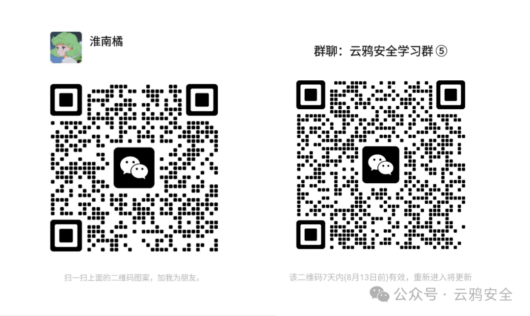获取方式:关注"云鸦安全"公众号,后台回复0807获取免费下载链接,扫描下方群二维码进群,在群公告处获取解压密码。