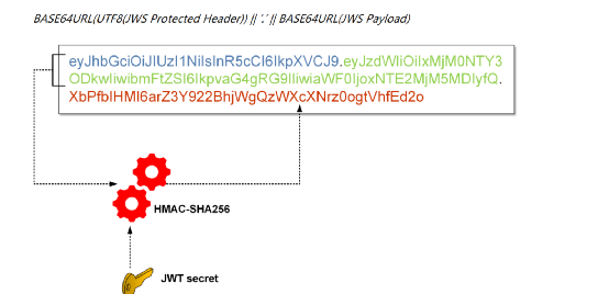 `// javascript``var encodedString = base64UrlEncode(header) + '.' + base64UrlEncode(payload);``var signature = HMACSHA256(encodedString, 'secret'); // TJVA95OrM7E2cBab30RMHrHDcEfxjoYZgeFONFh7HgQ`