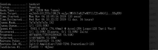 hashcat -m 16500 jwt.txt -a 3 -w 3 ?a?a?a?a?a?a