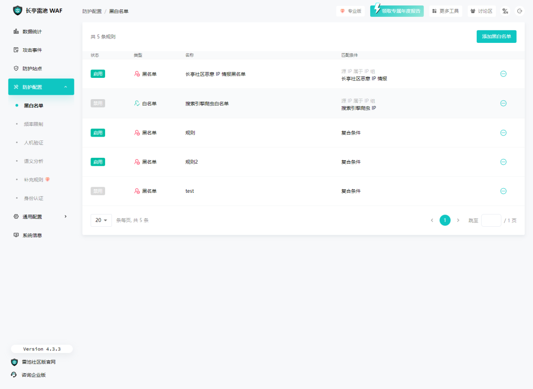 支持配置黑白名单、进行频率限制、人机验证、语义分析、补充规则、身份认证