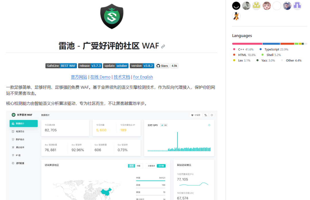 雷池由国内顶尖的网络信息安全公司长亭科技,在今年 4 月开源的网站防火墙工具。它迭代速度相当惊人,短短四个月的时间共发布了 30 多个版本,被超 4w 的网站站长使用,在 GitHub 收获了快 5K+ 的 Star✨。