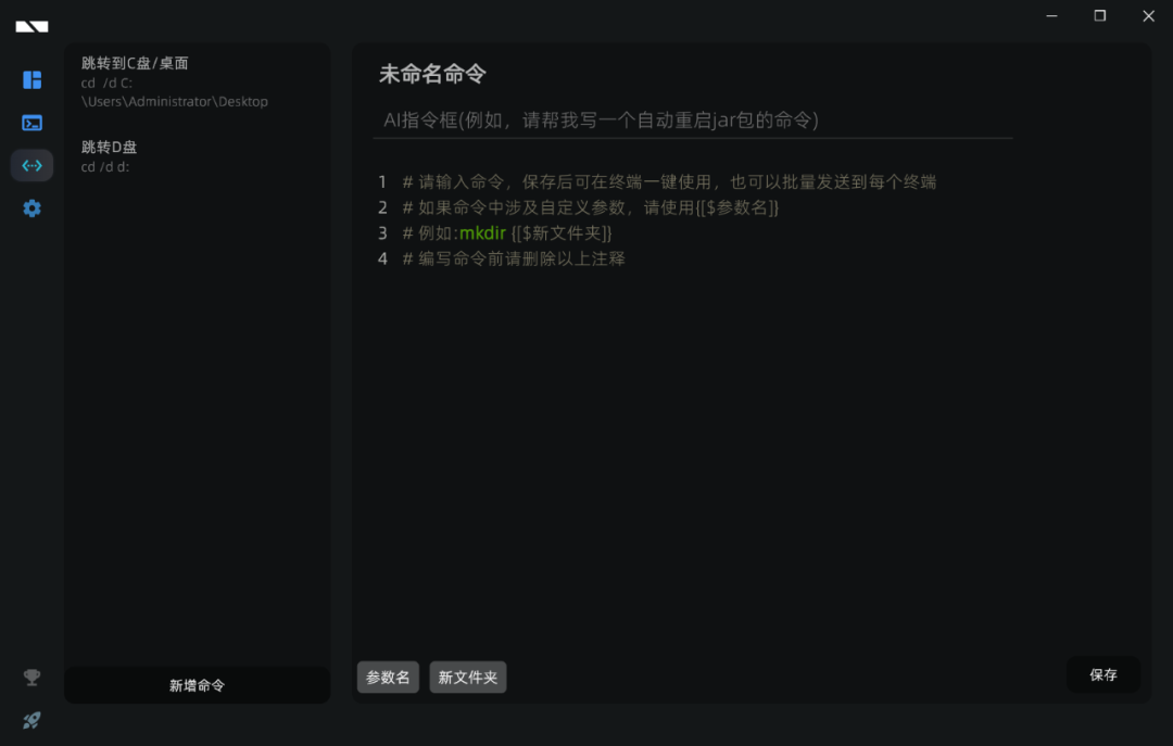 如果遇到一些比较复杂的命令,在添加命令的页面,还可以使用AI来生成,它也会告诉你命令的具体作用。
