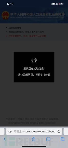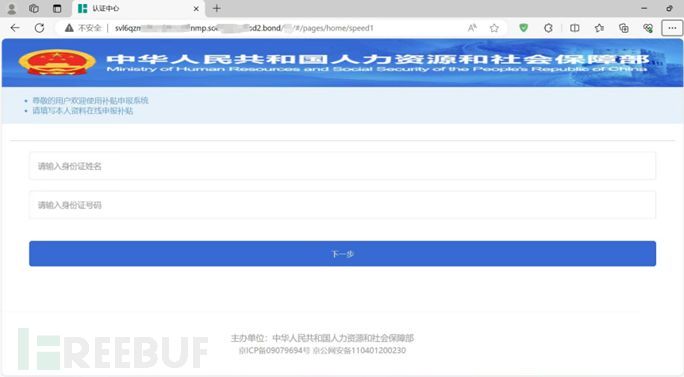 跳转到仿冒人力资源和社会保障部的钓鱼网站,该网页主要目的是钓取受害者身份信息,只要身份证号码格式正确则将跳转到下个页面: