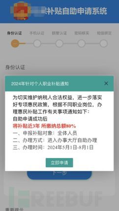 钓鱼网站会以补贴申报申明的方式诱导受害者点击“立即申请”按钮,随后进入钓鱼流程。