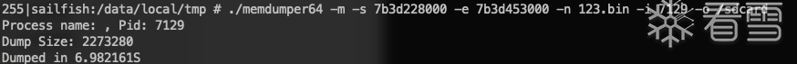 255|sailfish:/data/local/tmp # ./memdumper64 -m -s 7b3d228000 -e 7b3d453000 -n 123.bin -i 7129 -o /sdcard