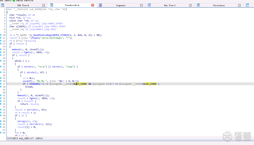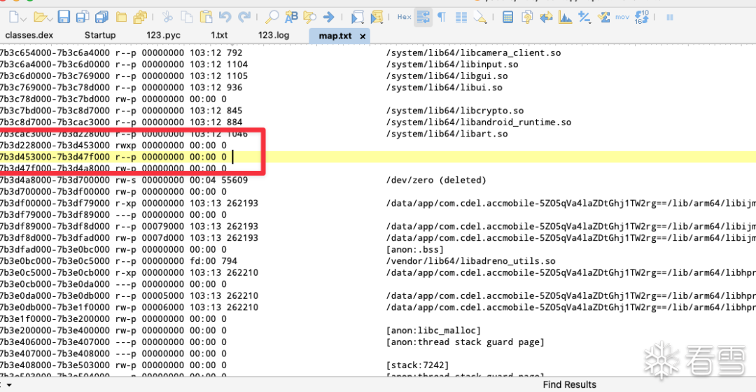 当然是去map查找他所在的段,查看是不是可执行的,如果是,那么目标so就使用了动态释放内存的操作,将可执行代码用mmap释放到内存中并执行。