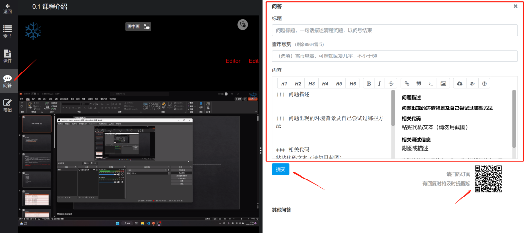 **在线答疑:**观看视频过程中有任何问题,可随时提问。提交后扫码订阅该问题,一旦有回复将通过微信及时提醒您。