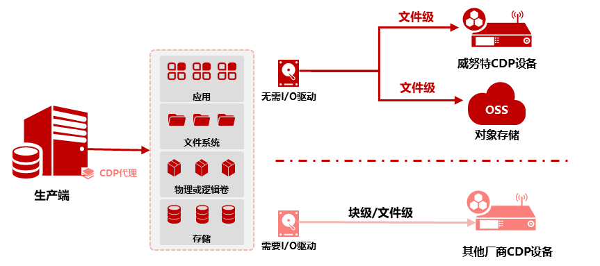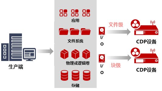 块级:基于块的CDP功能直接运行在物理的存储设备或逻辑的卷管理器上。当数据块写入生产数据的存储设备时,CDP系统可以捕获数据的拷贝并将其存放在另外一个存储设备中。