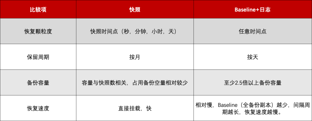 文件级:基于Baseline+日志,至少保留两份Baseline (可理解为全备数据),以及第一份Baseline 以来所有的日志数据。