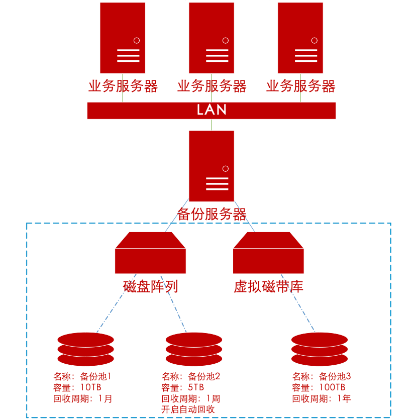 威努特数据备份与恢复系统通过介质池管理技术,将物理介质划分为供不同任务使用的介质池,并可管理每一个介质池的回收周期。