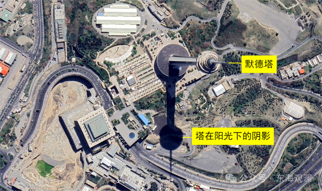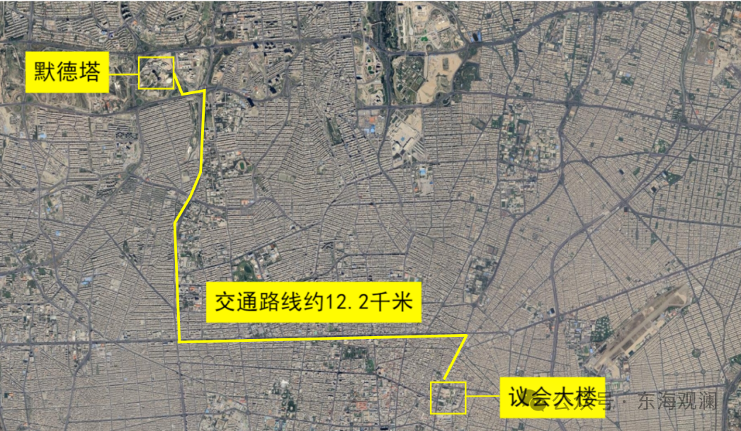 伊朗德黑兰局部卫星影像图,议会大楼至默德塔路线示意图