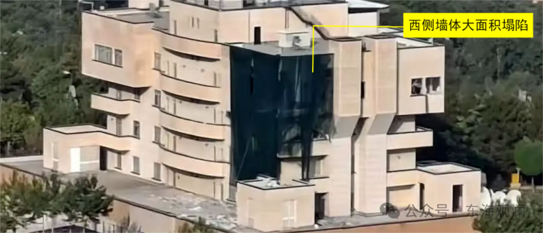 媒体曝光大楼受袭后的照片,受袭位置已覆绿色防尘纱网,房间整体结构未发生太大变化,顶层及下层楼板目视基本完好,仅北侧窗户及墙壁、西侧墙壁受损,推断爆炸威力不大
