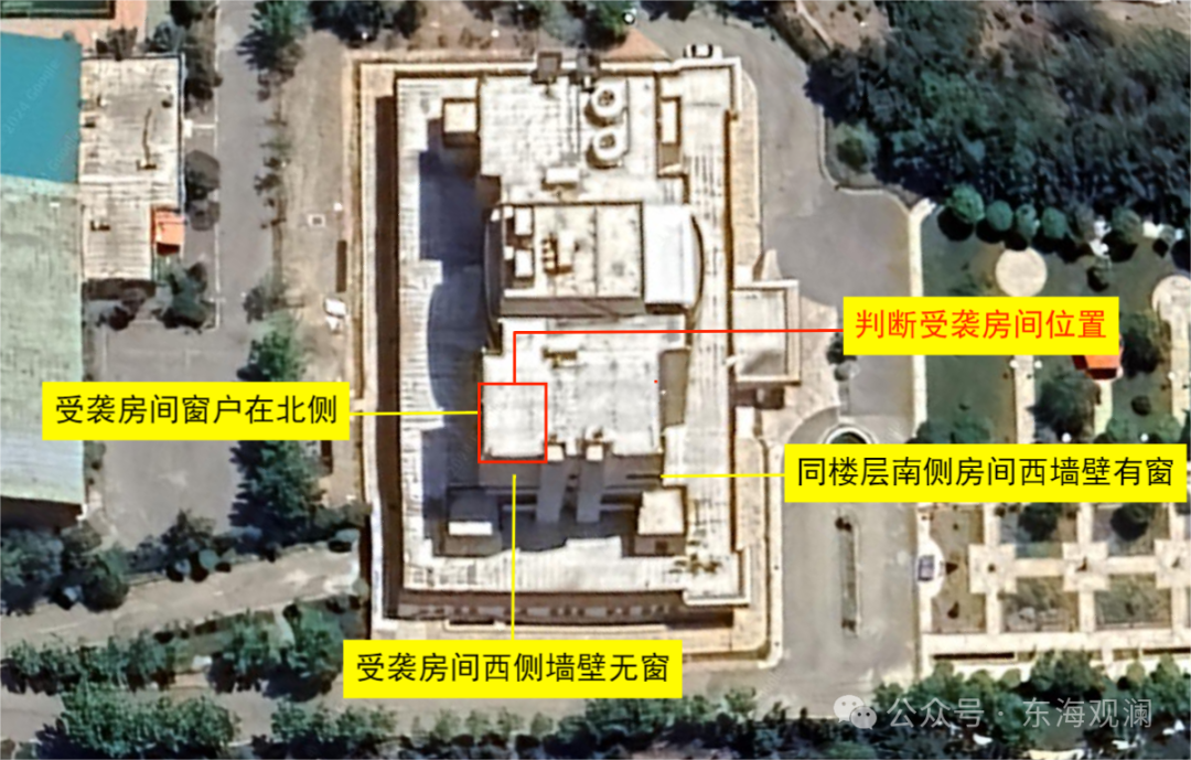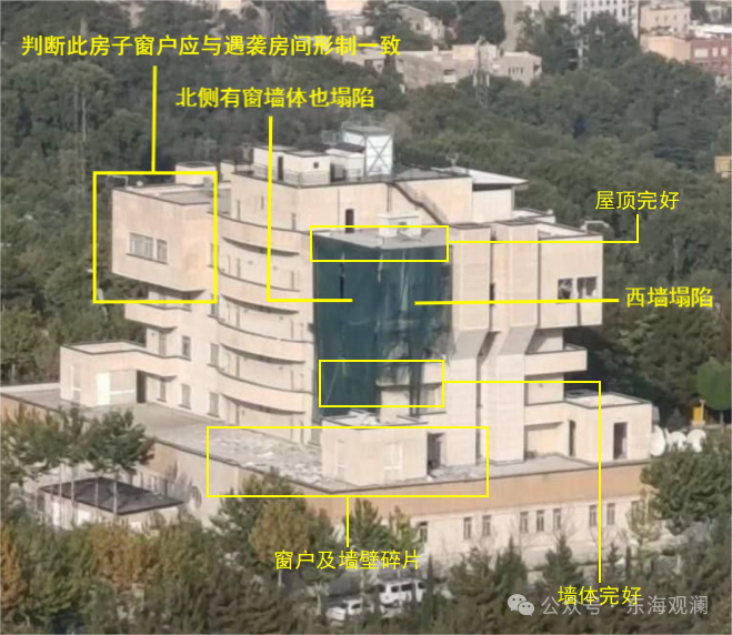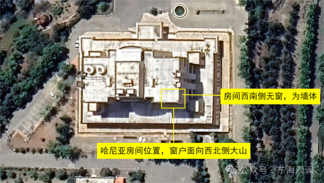 开源照片及历史卫星影像显示,哈尼亚所住大楼共有6层,哈尼亚所住房间位于5楼西北端,遇袭后哈尼亚所住大楼主体建筑完好无损,5楼顶部未发现明显弹洞或出现坍塌现象,受袭位置已覆绿布加以掩饰,隐约可见北侧窗户已被炸毁,西侧墙壁全部坍塌,南侧房间受爆炸冲击窗户损伤,一楼楼顶露台上及小方形角楼顶部散落大量爆炸造成的碎片。