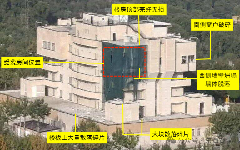 综合分析研判,此次袭击爆炸的威力不大,5楼房间整体结构未发生太大变化,顶层及下层楼板目视基本完好,仅北侧窗户及墙壁、西侧墙壁受损,同楼层其它房间窗户受损。
