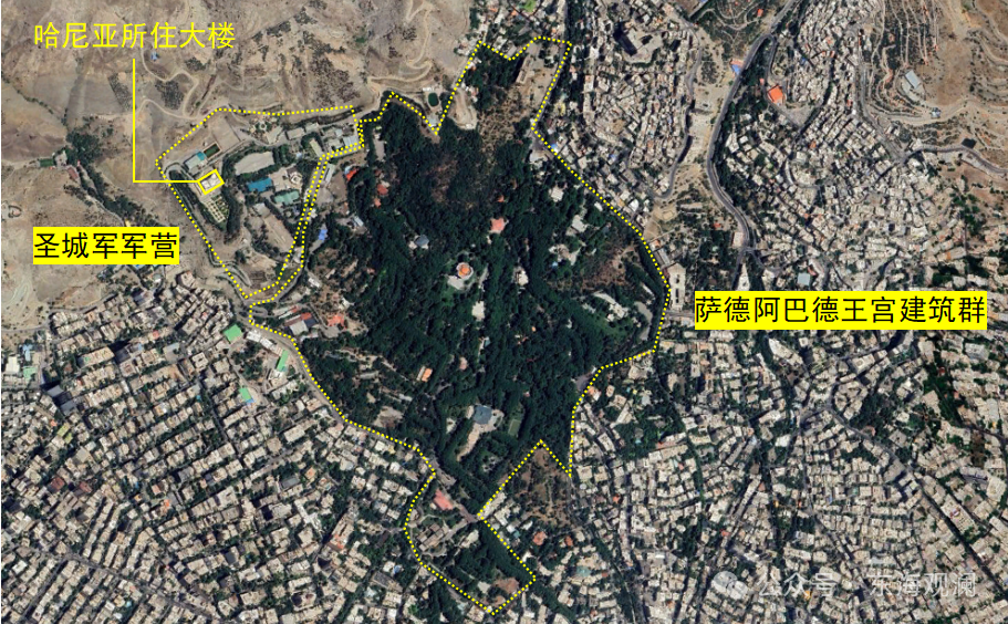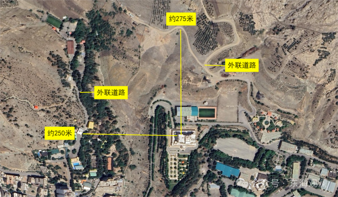 当地时间7月30日深夜,哈尼亚、随行保镖和其他与会外籍人员一起入住在德黑兰北部“伊朗革命卫队”(Revolutionary Guards)的一栋退伍军人招待大楼内。该大楼位于德黑兰北部的萨德阿巴德王宫建筑群的总统官邸西北侧约600米处,在“伊朗革命卫队”下属的特种部队“圣城军”指挥部所驻营区内。招待大楼坐落在一个小山包之上,四周沿坡建有2条外联道路,较为空旷且偏僻,从上一个参观点默德塔驾车沿公路行驶约11.1千米即可到达,推断路上行程时间20分钟左右,具体坐标为东经51°24'56",北纬35°49'09"。