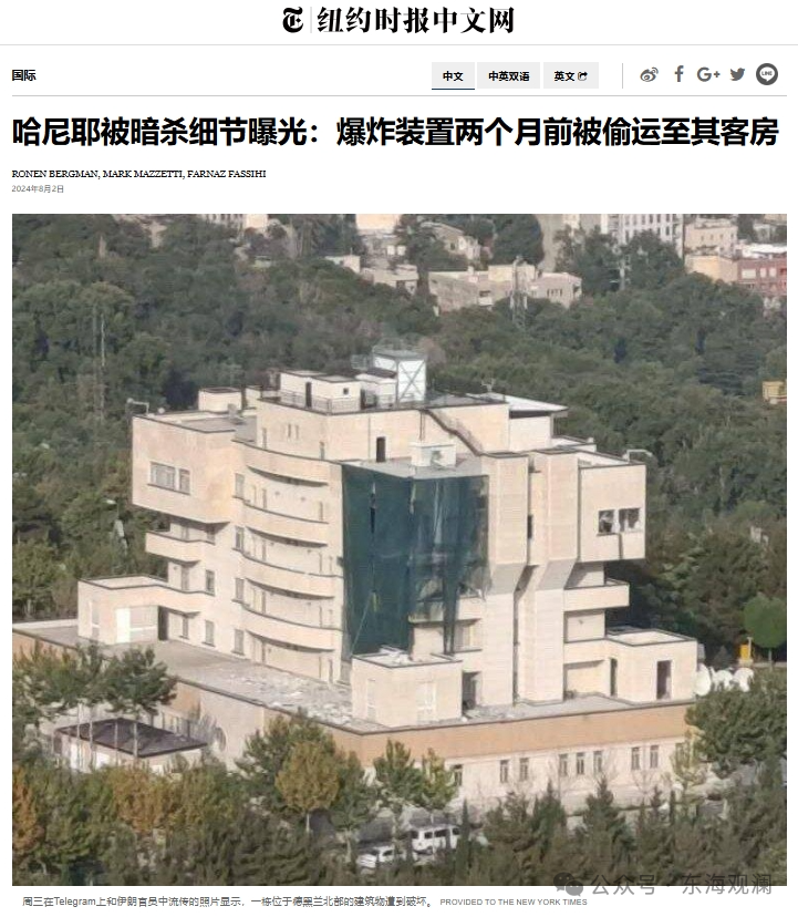 纽约时报8月2日公布的刺杀细节报道,称哈尼亚死于提前预制好的炸弹