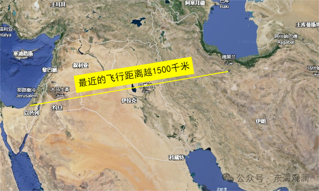 以色列本土至伊朗德黑兰的飞行距离示意图,因哈尼亚返回住所的具体时间是不确定的,因此从飞行距离判断以色列无法保证使用飞机或无人机实施袭杀的准确时间,由此排除飞机或无人机参与袭击的可能性