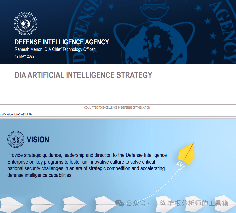 文本是由美国国防情报局(DIA)首席技术官Ramesh Menon于2022年5月12日发表的,主题关于DIA对人工智能(AI)的战略指导。该文件阐述了DIA在战略竞争和加速国防情报能力时代,为了解决关键的国家安全挑战而制定的AI策略。