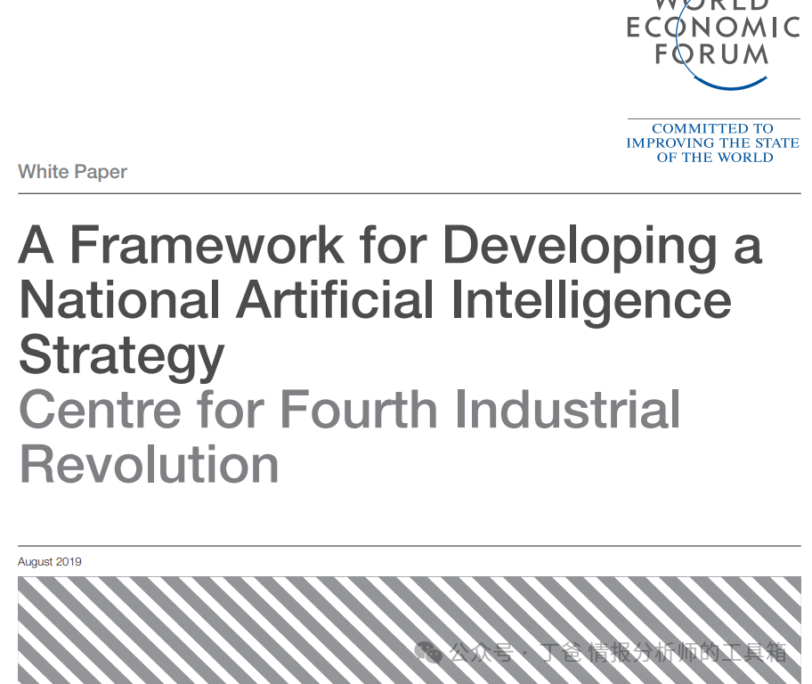 文本是由世界经济论坛发布的《制定国家人工智能战略的框架》,日期为2019年8月。该文件旨在指导各国政府在面对第四次工业革命时,如何制定和实施适合本国国情的人工智能(AI)国家战略。