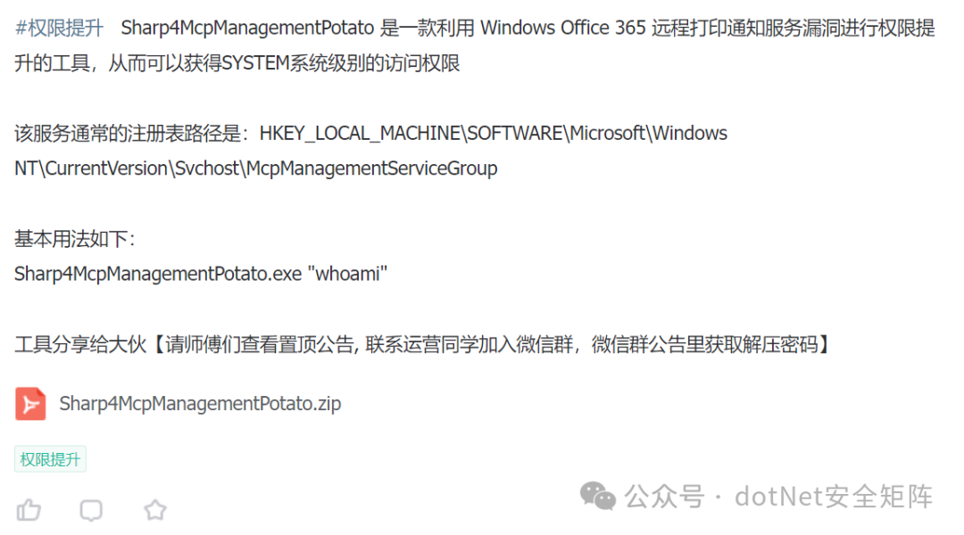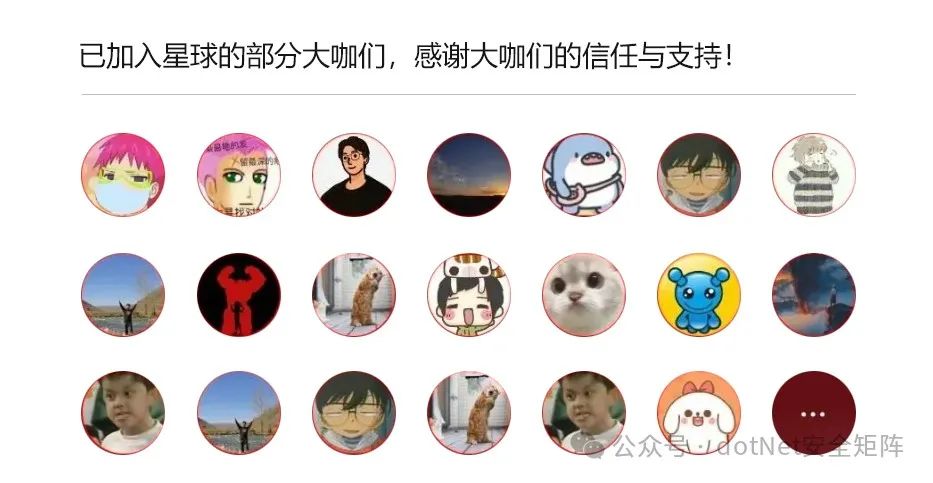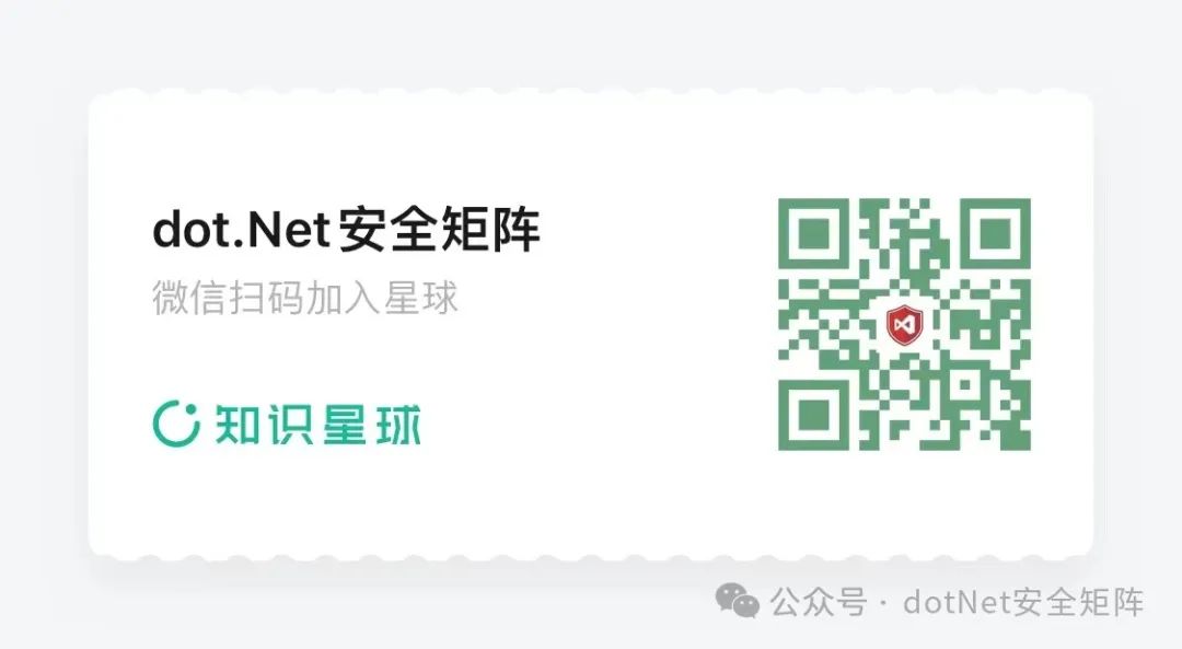 为了更好地应对基于.NET技术栈的风险识别和未知威胁,dotNet安全矩阵星球从创建以来一直聚焦于.NET领域的安全攻防技术,定位于高质量安全攻防星球社区,也得到了许多师傅们的支持和信任,通过星球深度连接入圈的师傅们,一起推动.NET安全高质量的向前发展。