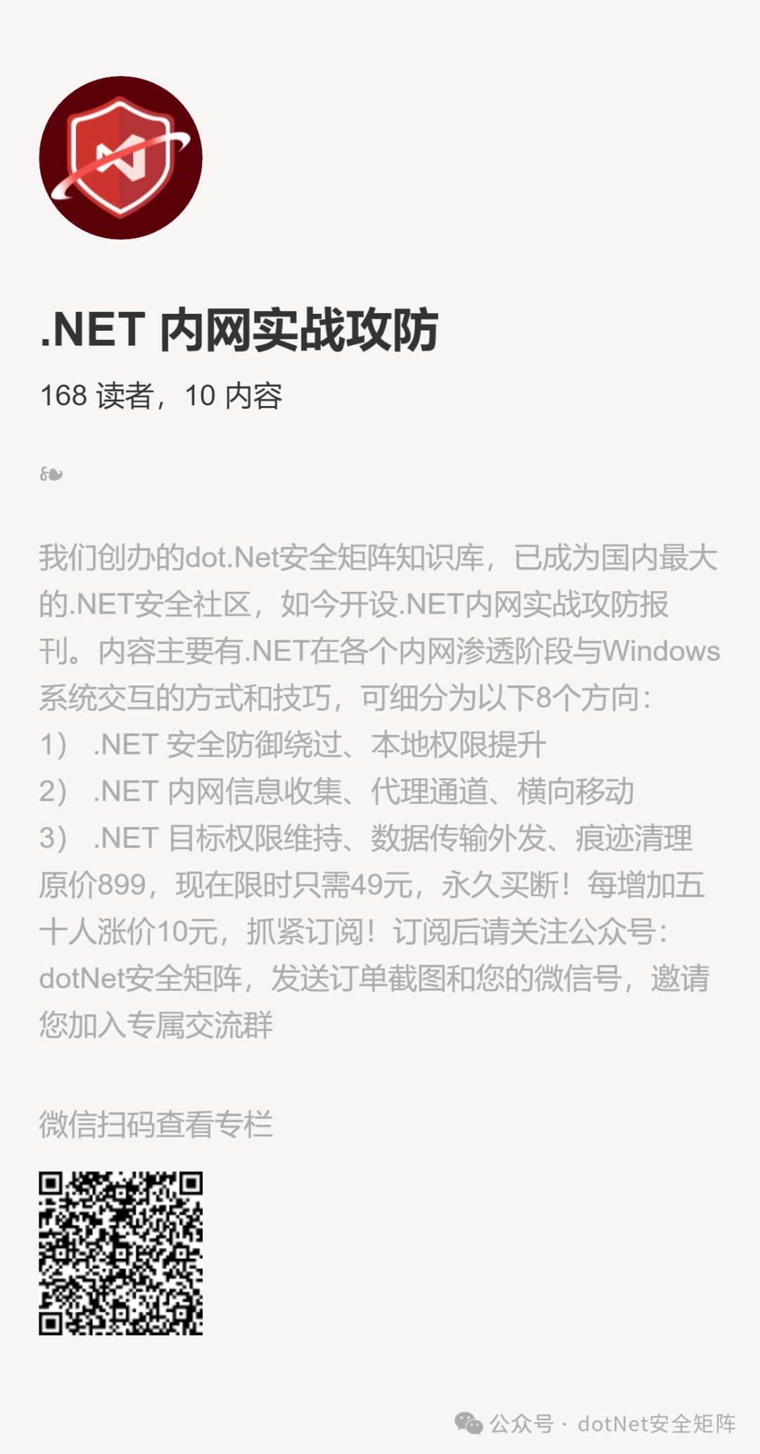 原价899,现在限时只需49元,永久买断!目前已有160+位朋友抢先预定,我们会长期更新,初步计划保持每周更新1-2篇新内容,对.NET内网安全感兴趣的朋友们请尽快订阅该报刊!