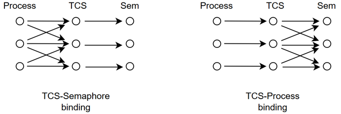 ESem 设计两种 TCS 管理模式。在 Thread-Semaphore Binding 模式下,访问 e-semaphore 需要竞争 TCS,所以不需要锁定 e-semaphore;在 Thread-Process Binding 模式下,进程只能访问绑定的 TCS,从而减少对 TCS 的竞争,但是 TCS 会竞争 e-semaphore,所以 ESem 在这种模式下引入自旋锁来进行访问保护。另外,ESem 还支持 SGX Switchless 模式,这将提高某些场景下的性能。