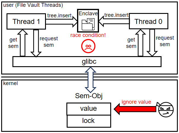第一种是 file tree race。来自内核的攻击者忽略了 semaphore 对象的真实值。线程0请求 semaphore,它可以直接获取 semaphore。然后,它在 enclave 中插入一个新的 file tree 节点。在关键操作完成之前,线程1也可以直接获取 semaphore 并对 file tree 进行操作。此时,就会出现竞争条件,enclave 中的 file tree 将被破坏。