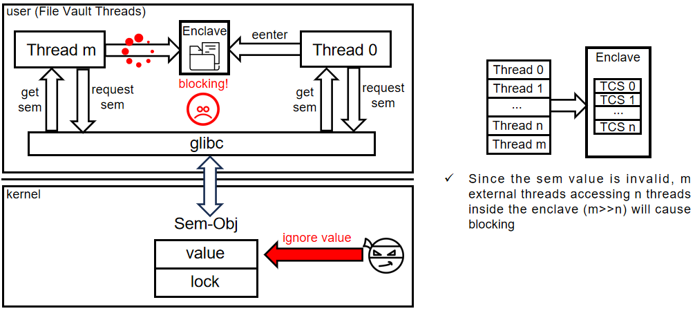 第二种是 service thread blocking,这种攻击方式和第一种类似,但后果不同,由于 TCS 数量受限,且忽略 semaphore 的值,导致所有进程都能获得 semaphore,并等待进入 enclave,会导致服务线程阻塞,性能降低。