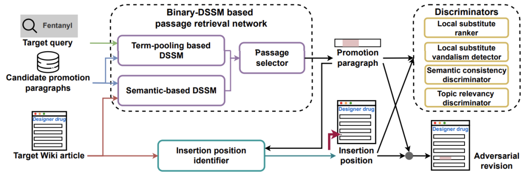 具体来说,针对一个查询,MAWSEO首先获取一组相关的文章,并通过在其中添加一个包含推广内容的新段落来实现对抗性修订。为生成这些候选推广段落,我们尝试在收集到的其他维基段落中找到合适的位置注入推广内容,以确保语法正确和语言流畅。为此,我们训练了一个基于命名实体识别的激励注入模型。然后,我们设计了基于生成对抗网络的多任务对抗性段落检索模型(Multi-task adversarial passage retrieval model),从候选推广段落中选择最合适的一个,以实现一系列攻击目标。一旦检索成功,这个段落会被添加到相关文章中的合适位置。
