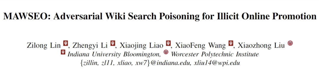 今天为大家推荐的论文是由印第安纳大学廖晓静教授课题组、印第安纳大学王晓峰教授课题组和伍斯特理工学院刘晓钟教授课题组合作完成的关于利用维基系统进行非法推广与排序攻击的工作MAWSEO: Adversarial Wiki Search Poisoning for Illicit Online Promotion。该工作目前已发表于IEEE S&P 2024。