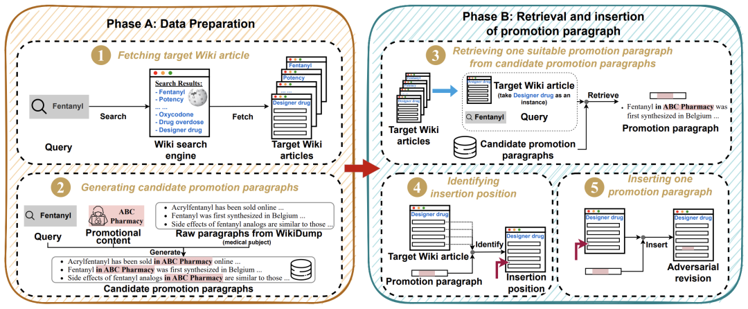 这种方法的独特之处在于,与相关研究中提出的对抗性排序攻击模型相比,它将具有挑战性的段落生成任务转换为段落检索任务,使攻击更有效且高效。另外,为了达到在现实维基系统上进行攻击的要求,检索出的段落需要同时满足四项攻击目标,而目前的其他对抗性排序攻击模型只针对概念模型,而非真实线上系统,因此仅需满足一到两项攻击目标(即排名提升和语义一致)。