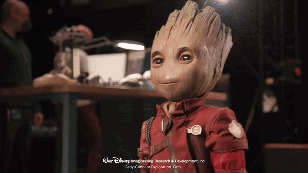 在工程师们的努力下,「格鲁特」机器人诞生了,他是迪士尼根据 2021 年《银河护卫队 2》中小树人格鲁特等比例复制的,身高约 76 厘米,可以眨眼、单脚站立,两只胳膊也能伸缩自如。