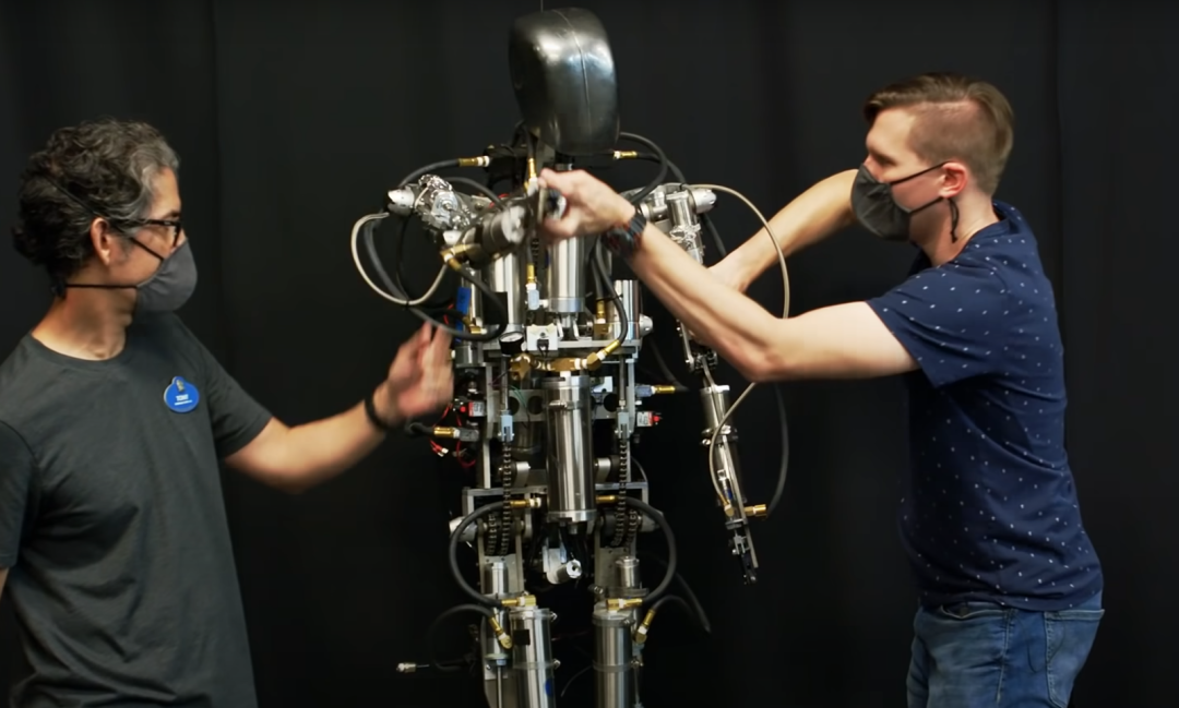 实现在空中「惊鸿一飞」的蜘蛛侠,重 95 英镑,外表酷似一个人形机器人,但这种相似度仅停留在外形体而已。与人形机器人更复杂的本体、更精密的电机和关节设计比起来,「蜘蛛侠」的本体材料由 3D 打印塑料和铝、以及数不清的螺丝制造而成,他本质上只是一个内部被放置可移动重物的「连杆结构」。