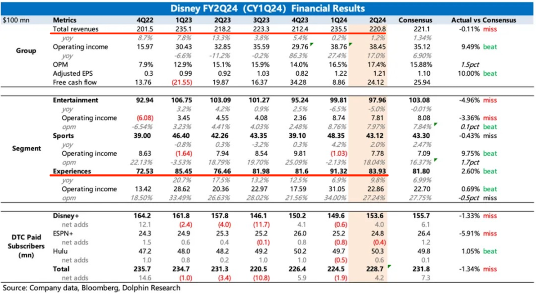 但回溯过去两年迪士尼财报,「体验」(experience)板块的同比长期处于下滑趋势,从 2023 年 Q1 的 20.7% 落到 2024 年 Q1 的 6.9%,尽管「体验」(experience)板块 2024 年 Q2(83.93 亿美金)营收的同比 2023 年 Q2(76.46 亿美金)上升 9.8%,但环比 2024 年 Q1(91.32 亿美金)下滑 8.1%。