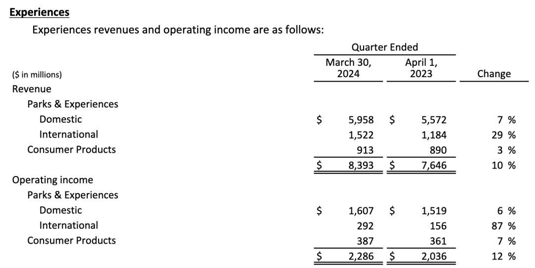 迪士尼 2024 年 Q2 财报显示,Parks&Experiences 国内(Domestic)的营收同比去年增长 10% 左右,但财报也提到,「国内公园和体验的营业收入增加是由于华特迪士尼世界度假区和迪士尼游轮公司的业绩增长,部分被迪士尼乐园度假区业绩下降所抵消。」