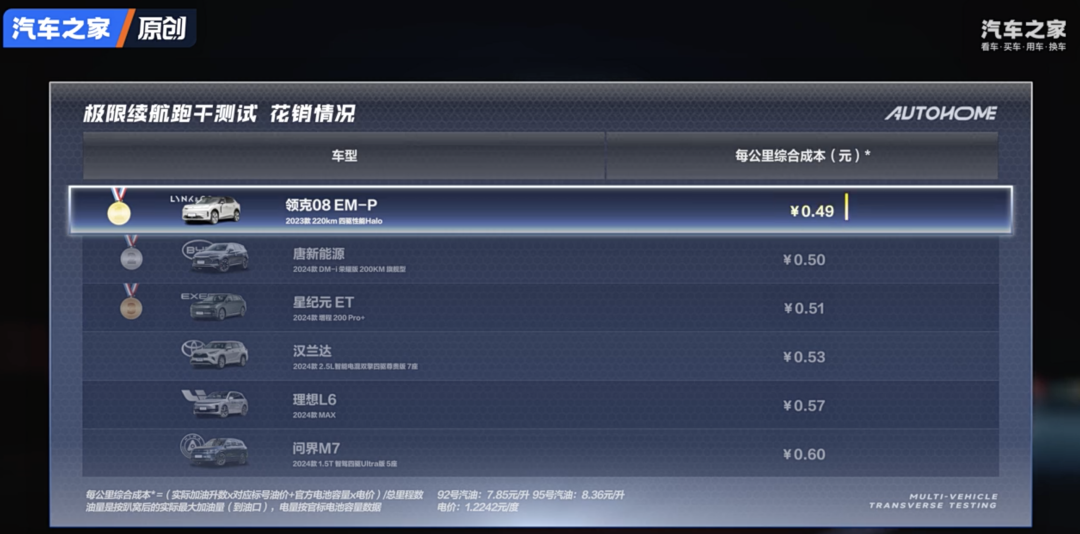 另外,根据汽车之家的极限续航花销测算,领克 08 四驱版每公里综合成本仅需 0.49 元,同样位列插混与增程车型组别第一,稳居「最省混动 SUV」的宝座,比很多网红车都更省。