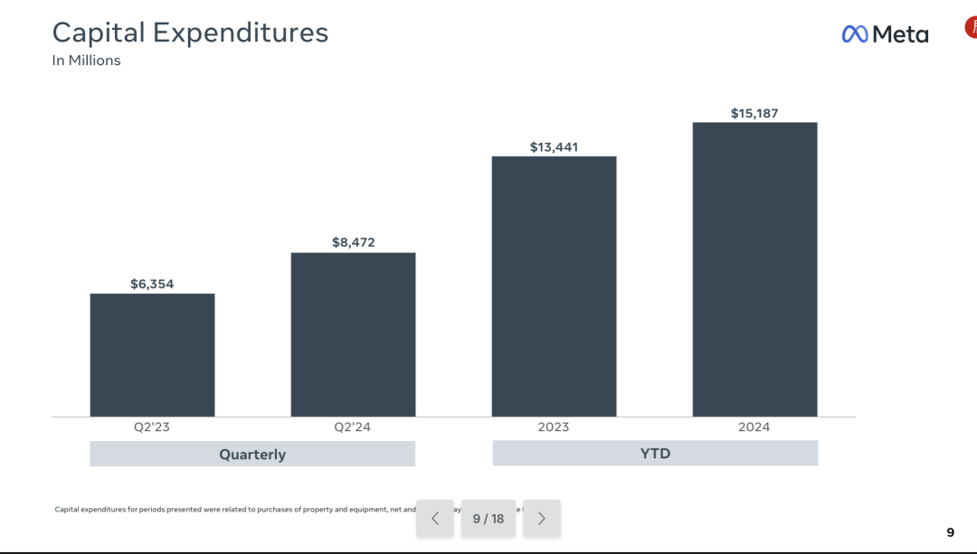 值得庆幸的是,Meta 最终赶上了大模型的第一梯队。在对谈中扎克伯格提到,大模型的搭建要求 Meta 持续购买大量 GPU。这笔费用在财报中也有所体现,本季度资本支出比上一季度增长了约 21 亿美元。