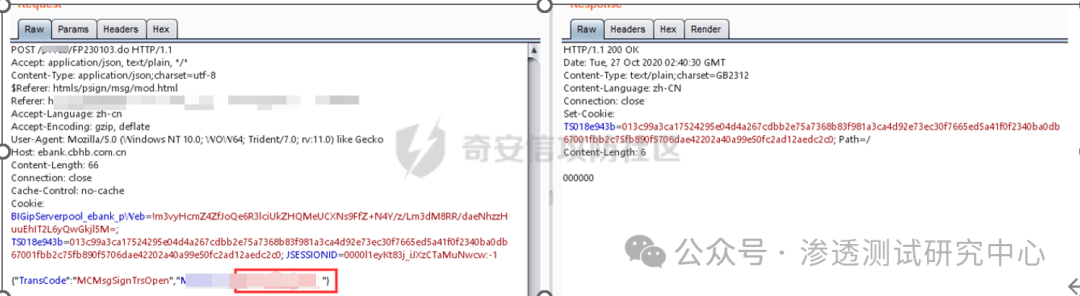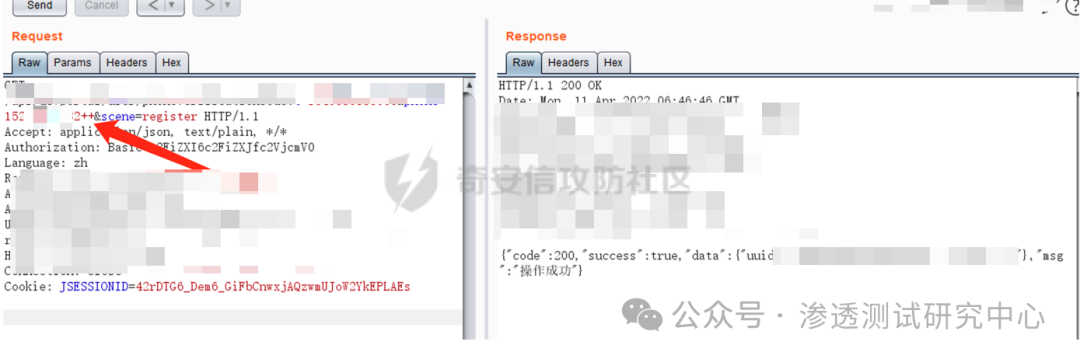在抓取短信验证码的数据包后,在 response 可以看到短信验证码