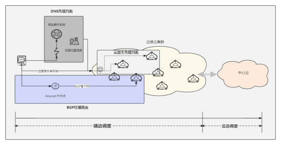 边缘计算的流量调度场景主要分为端边调度和云边调度,部分场景会出现边边调度。不同调度阶段拥有相对成熟的调度技术,包括基于DNS的端边调度、基于BGP ANYCAST的骨干网路由调度以及云网络下的云原生流量调度。