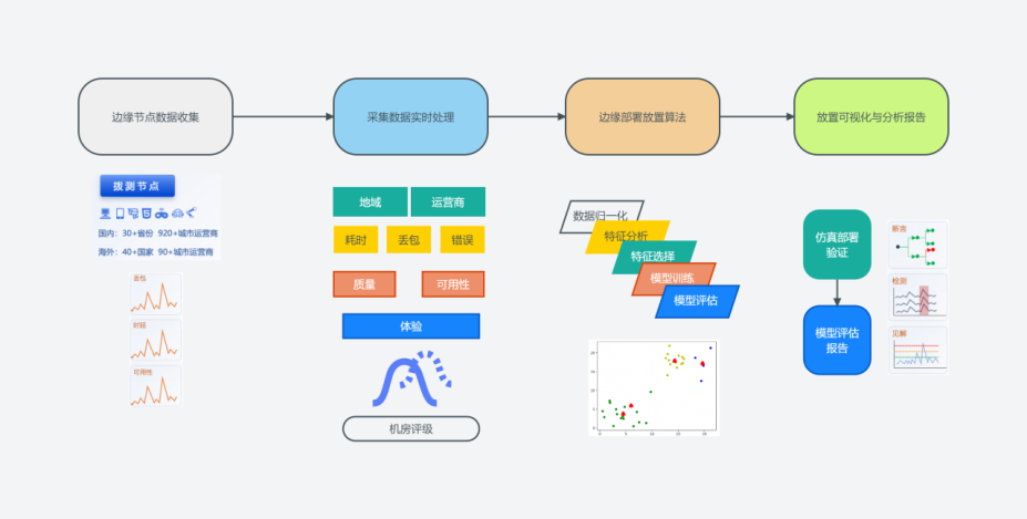 针对基于流量特征和边缘节点资源质量的放置问题,在实践过程方案,HTTPDNS团队不断进行尝试优化,最终选择通过使用全链路的拨测和数据采集方法,基于实时数据驱动的模式,进行在线的放置算法仿真训练,形成可视化的评价模型,以指导HTTPDNS服务在边缘机房的节点选择和服务放置。基本流程如下图: