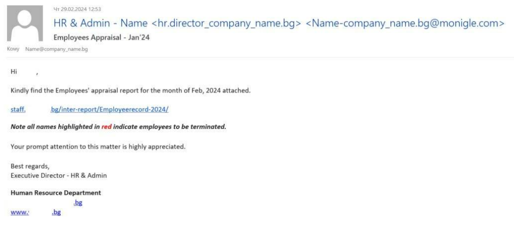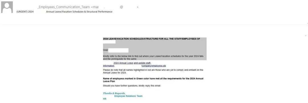 使用幽灵欺骗的人力资源钓鱼电子邮件:发件人的姓名包含人力资源团队的电子邮件地址,使电子邮件显得尤为真实