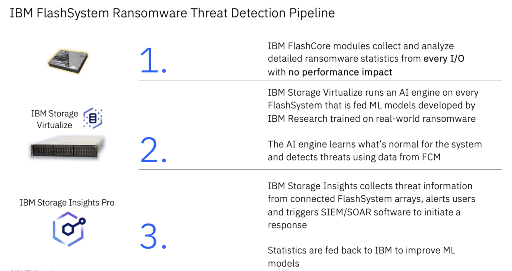 IBM近期也推出了相关存储产品FlashSystem可以防御勒索软件。该产品在数据写入过程中,会以块级粒度扫描所有传入数据。整个过程将涉及内联数据损坏检测软件以及云端AI方案,借此识别出可能象征网络攻击(包括勒索软件)的异常情况。依托于此类早期检测机制,管理员可以立即采取响应以缓解攻击影响。第四代FCM技术使用机器学习模型持续监控从每项输入/输出(I/O)操作中收集到的统计数据。IBM训练的这些模型能够检测出包括勒索软件行为在内的多种异常情况。IBM公司苏黎世研究团队负责协助维护勒索软件I/O签名数据库,这套数据库将帮助系统持续对齐不断变化的威胁形势。
